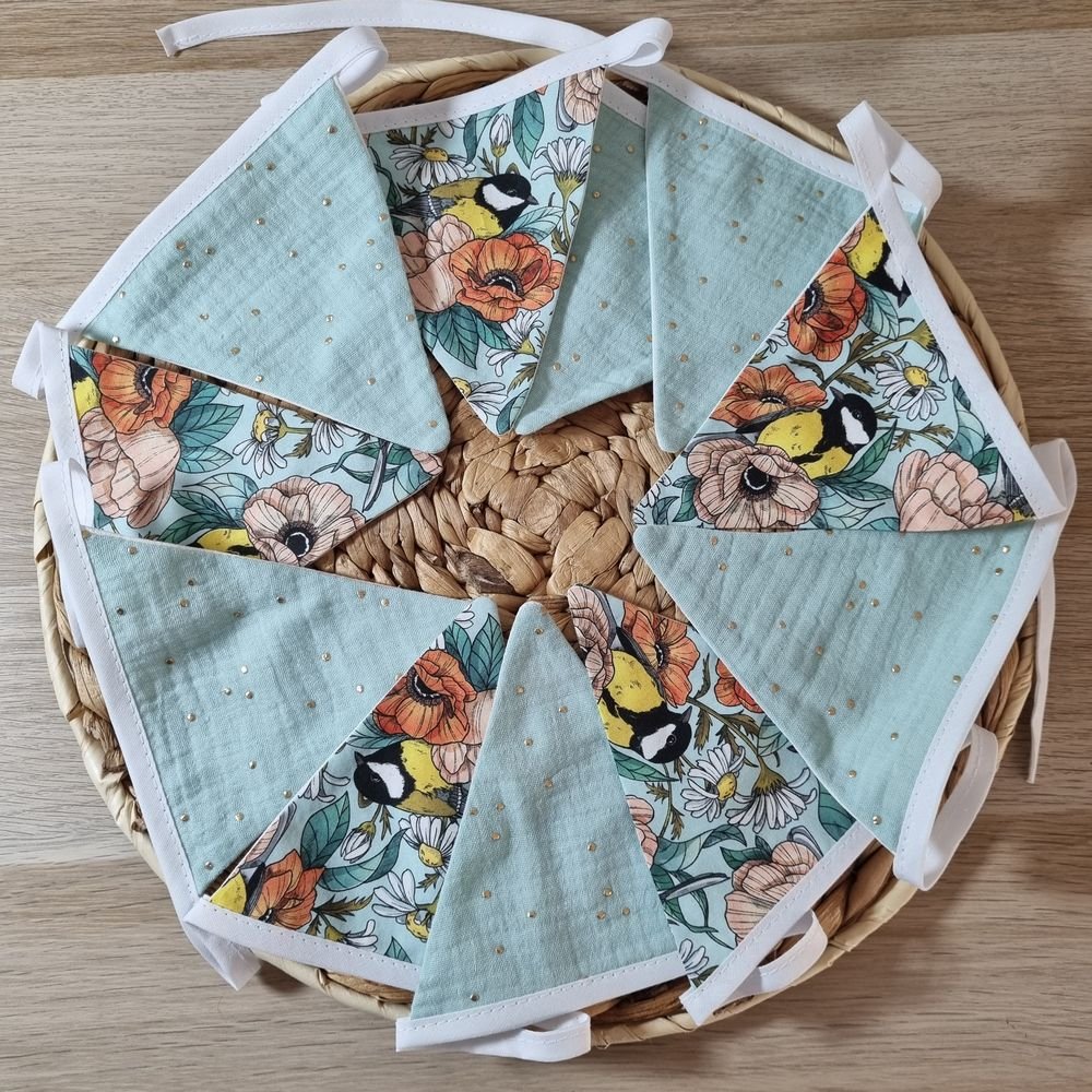 Apportez une touche unique et festive à votre décoration avec notre guirlande de fanions artisanale, mélangeant popeline de coton à motifs originaux et gaze de coton colorée avec pois dorés. L’association de ces deux tissus crée un effet bohème et raffiné, idéal pour toutes les occasions.